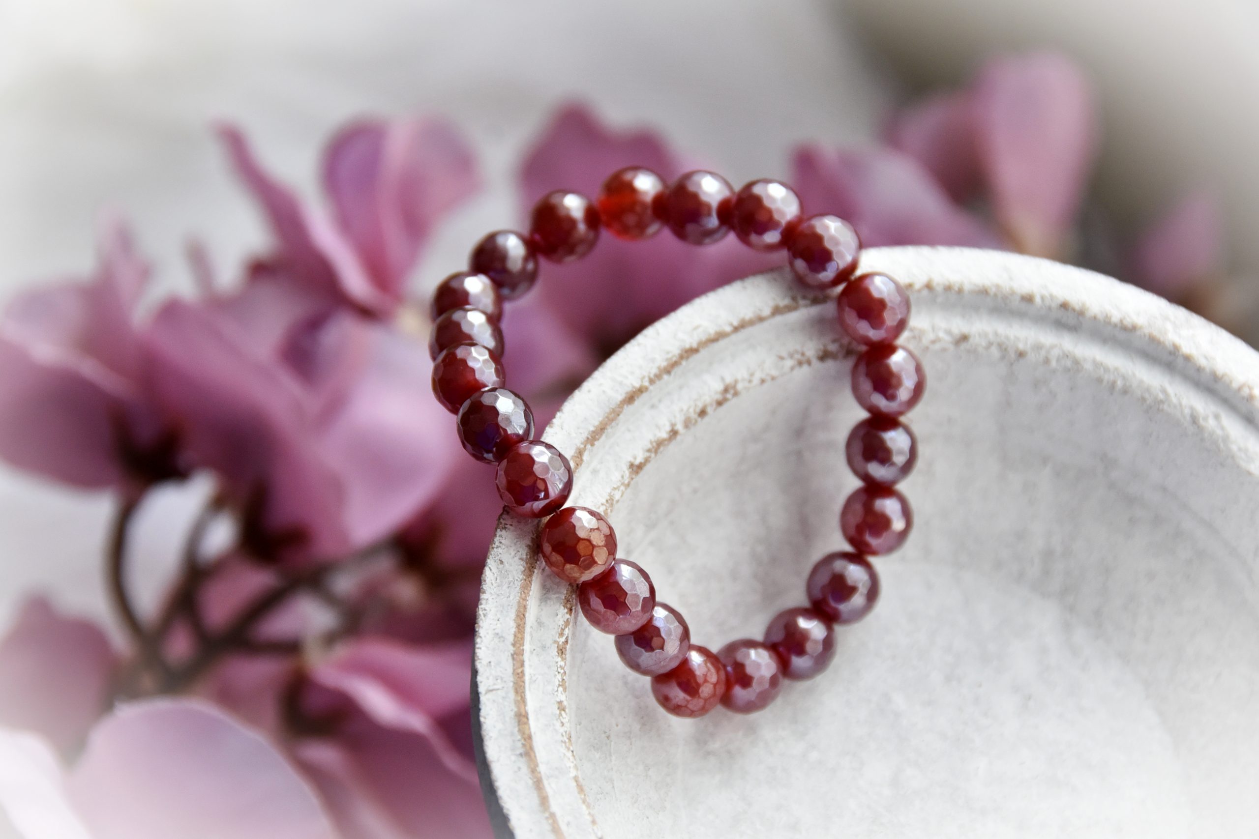 8 mm-es csiszolt Aura Acháttal készült, kézműves ékszer. Rugalmas, gumidamillal készült, valódi ásványkarkötő.
