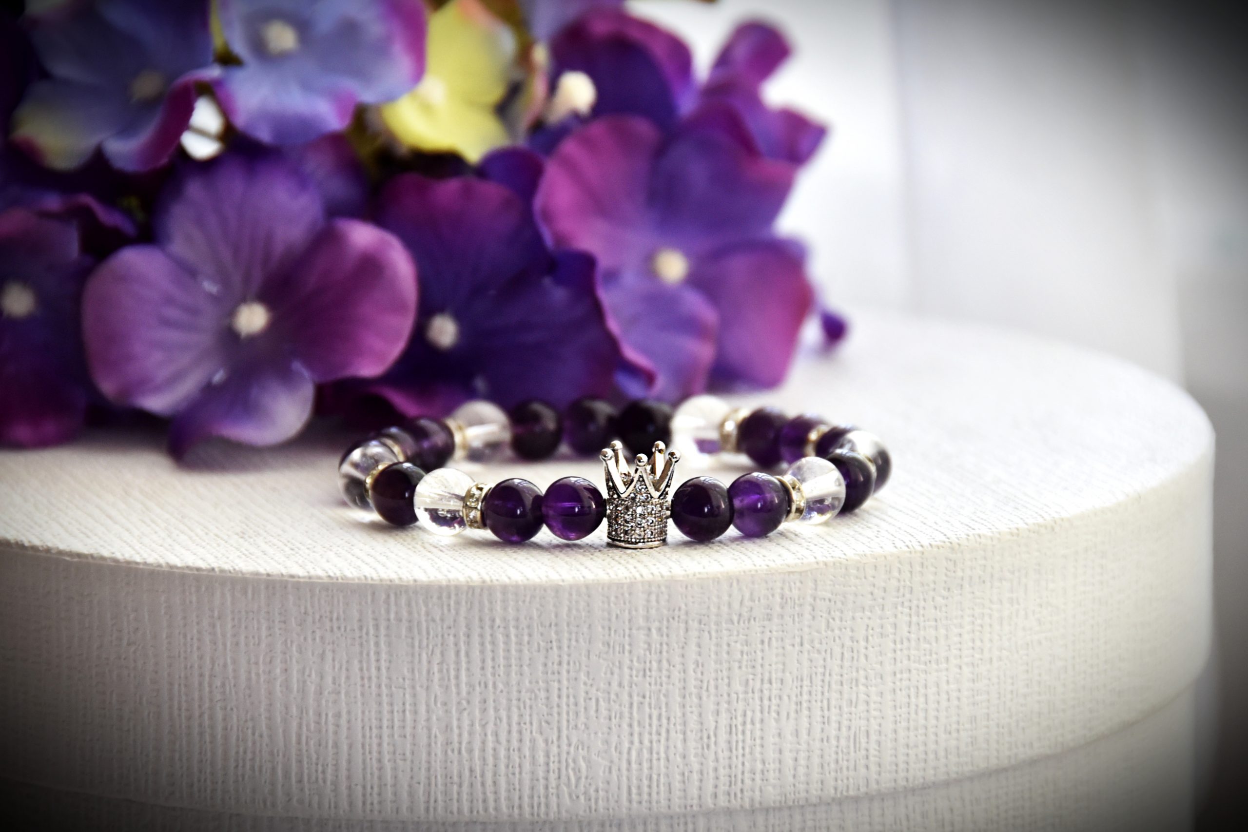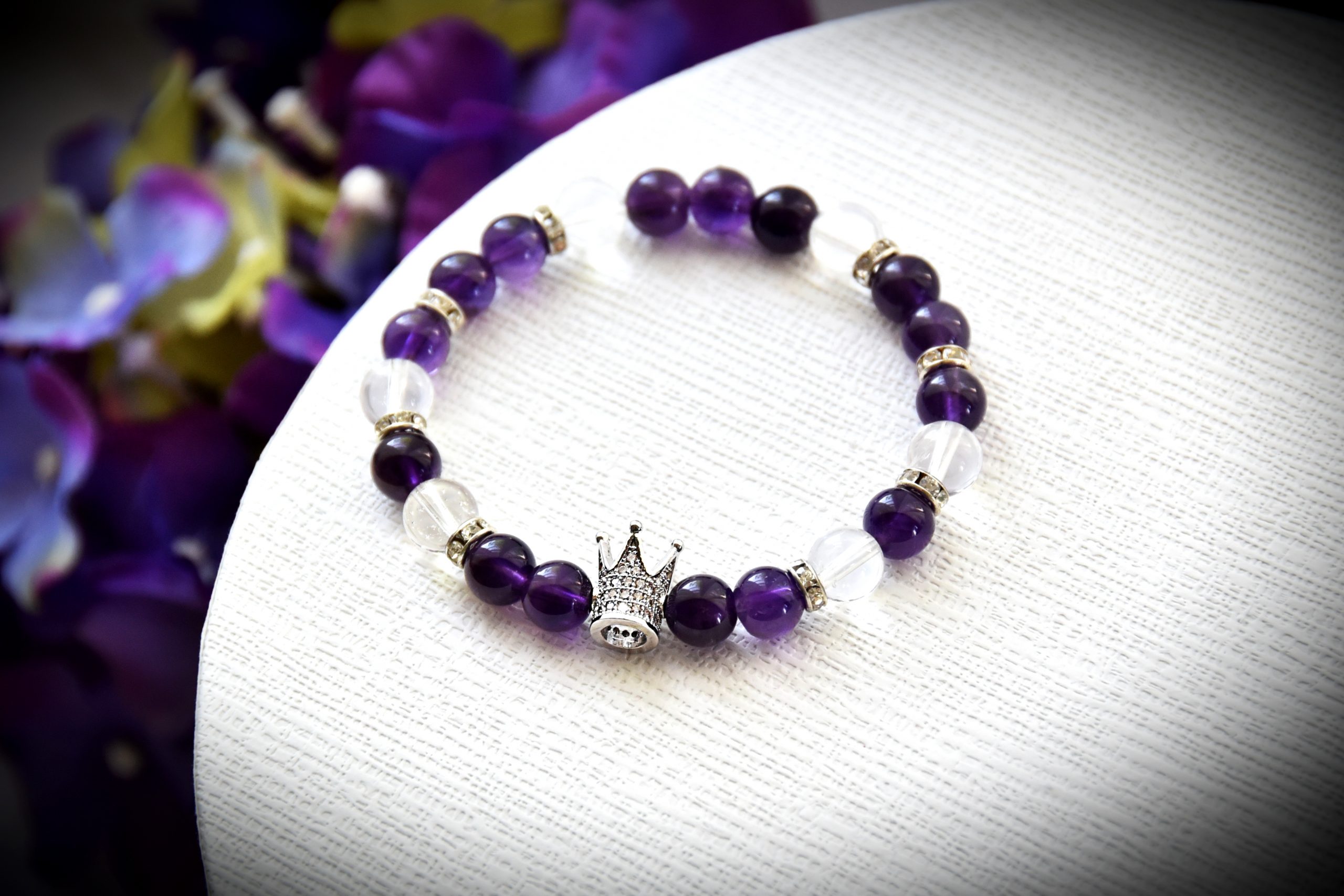 Ametiszt Cirkónia Ásványkarkötő Hegyikristállyal. Kézműves termék, gumidamillal, Cirkónia koronával, csillogó nikkelmentes rondellel; valamint Ametiszt és Hegyikristály ásvánnyal. Egyedi kérés és méret esetén, fordulj hozzám bizalommal!
