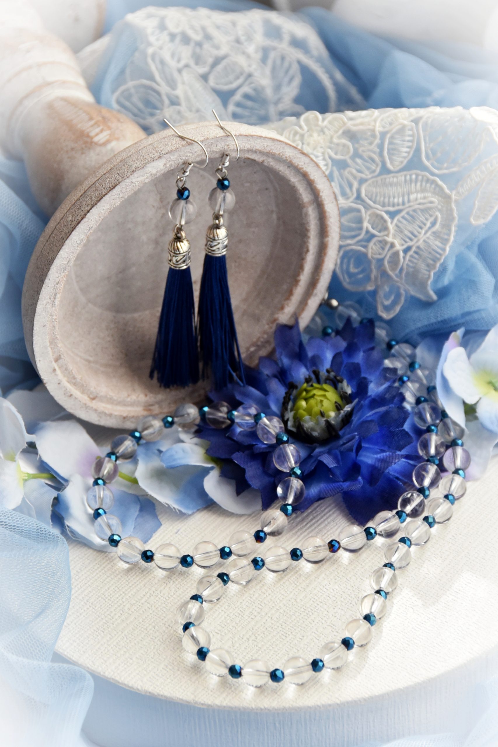 A szetthez illő, nikkelmentes szerelékkel, kék csodálatos bojttal készült fülbevalóval.