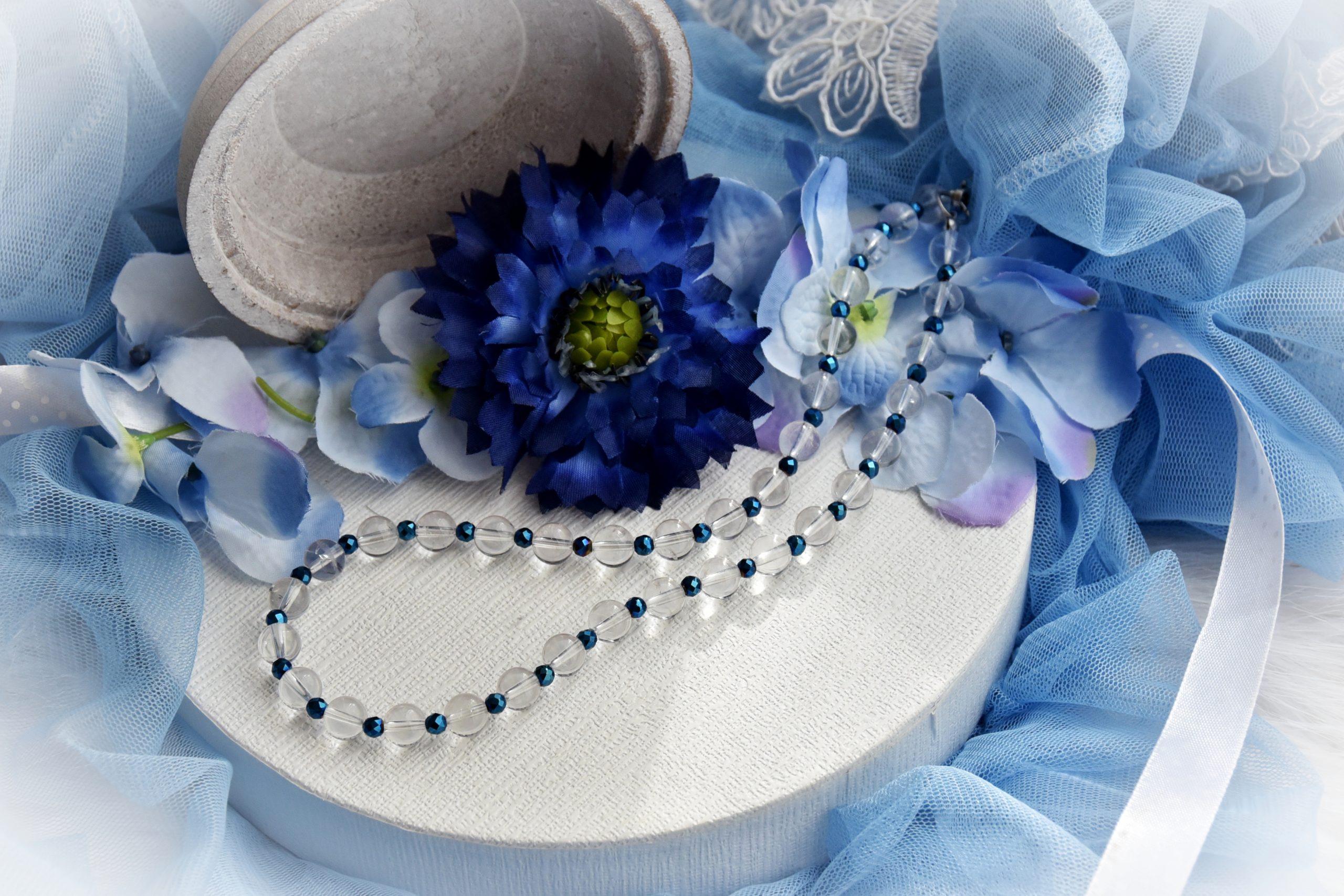 8mm-es Hegyikristály és 3mm-es csiszolt Hematit ásványból készült, nikkelmentes szerelékkel ellátott nyaklánc. A lánc hossza: 50cm.