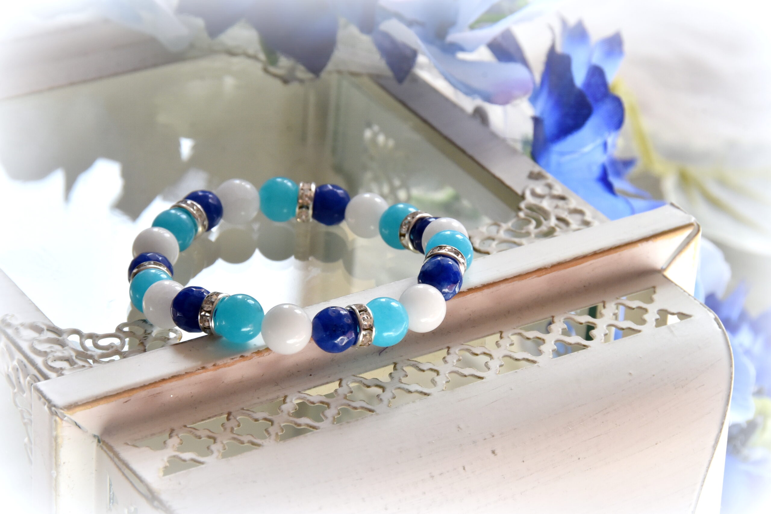 8 mm-es fehér, türkizkék és sötétkék Jade ásvánnyal, gumidamilra felfűzött ékszer. Kézműves termék, válaszd ki a számodra megfelelő méretet! Egyedi kérés és méret esetén, fordulj hozzám bizalommal!