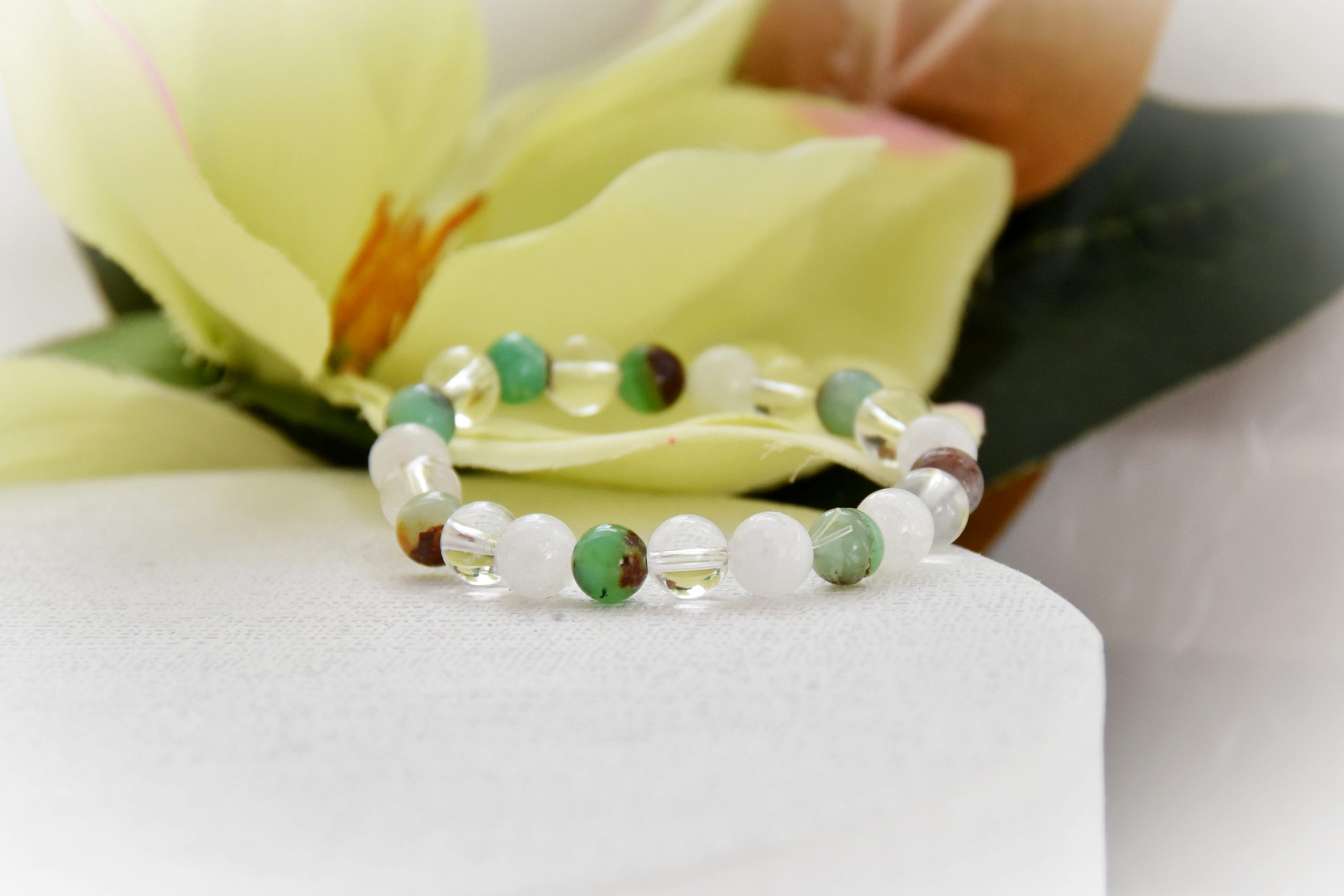 8 mm-es Hegyikristály és Krizopráz ásványból készült karkötő. Kézműves ékszer, gumidamillal elkészítve. Válaszd ki a számodra megfelelő méretet! Egyedi kérés és méret esetén, fordulj hozzám bizalommal!