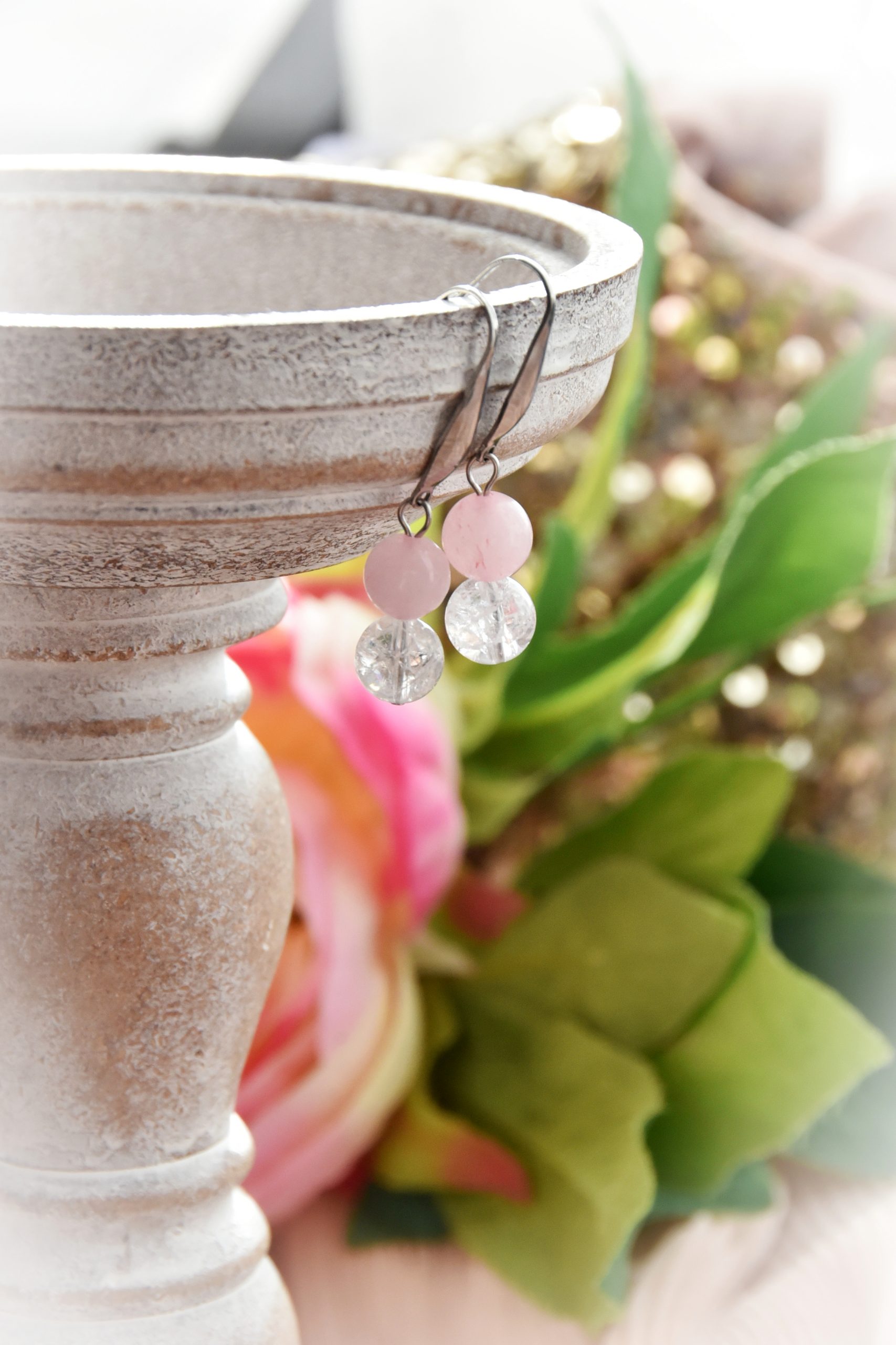8mm-es Rózsakvarc és Hegyikristály ásvánnyal készült, nemesacél fülbevaló akasztóval kombinált termék. A kézműves ékszer, tartósan megőrzi szépségét, a nemesacél kiváló tulajdonságának köszönhetően, fémérzékenyek előszeretettel használják.