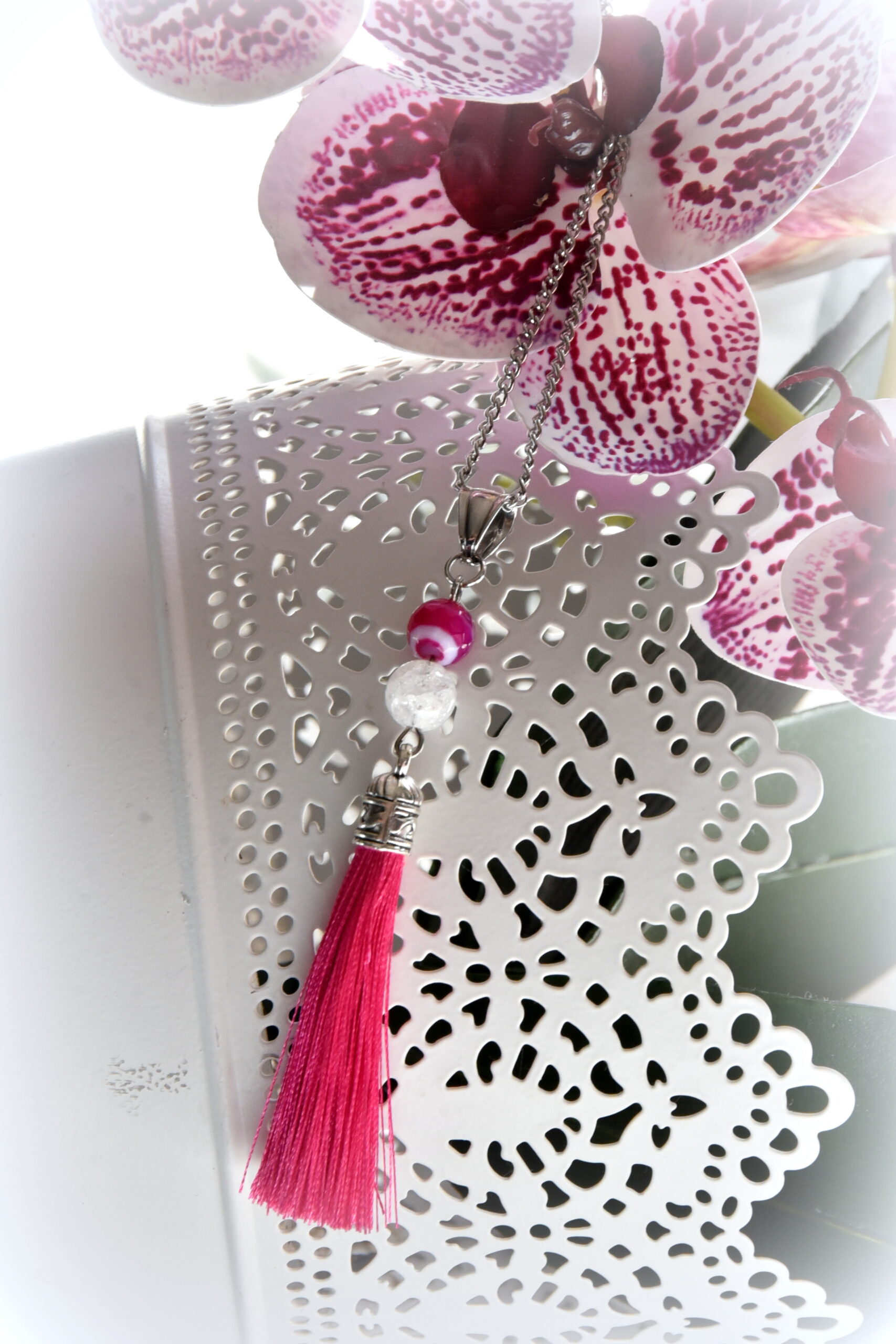 Achát és Hegyikristály Bojt nyaklánc. Kézműves termék, Achát és Hegyikristály ásvánnyal, acél ékszerlánccal és pink bojttal. A termék hossza kb.: 35 cm, lánchosszabbítóval van ellátva. Egyedi kérés és méret esetén, fordulj hozzám bizalommal!
