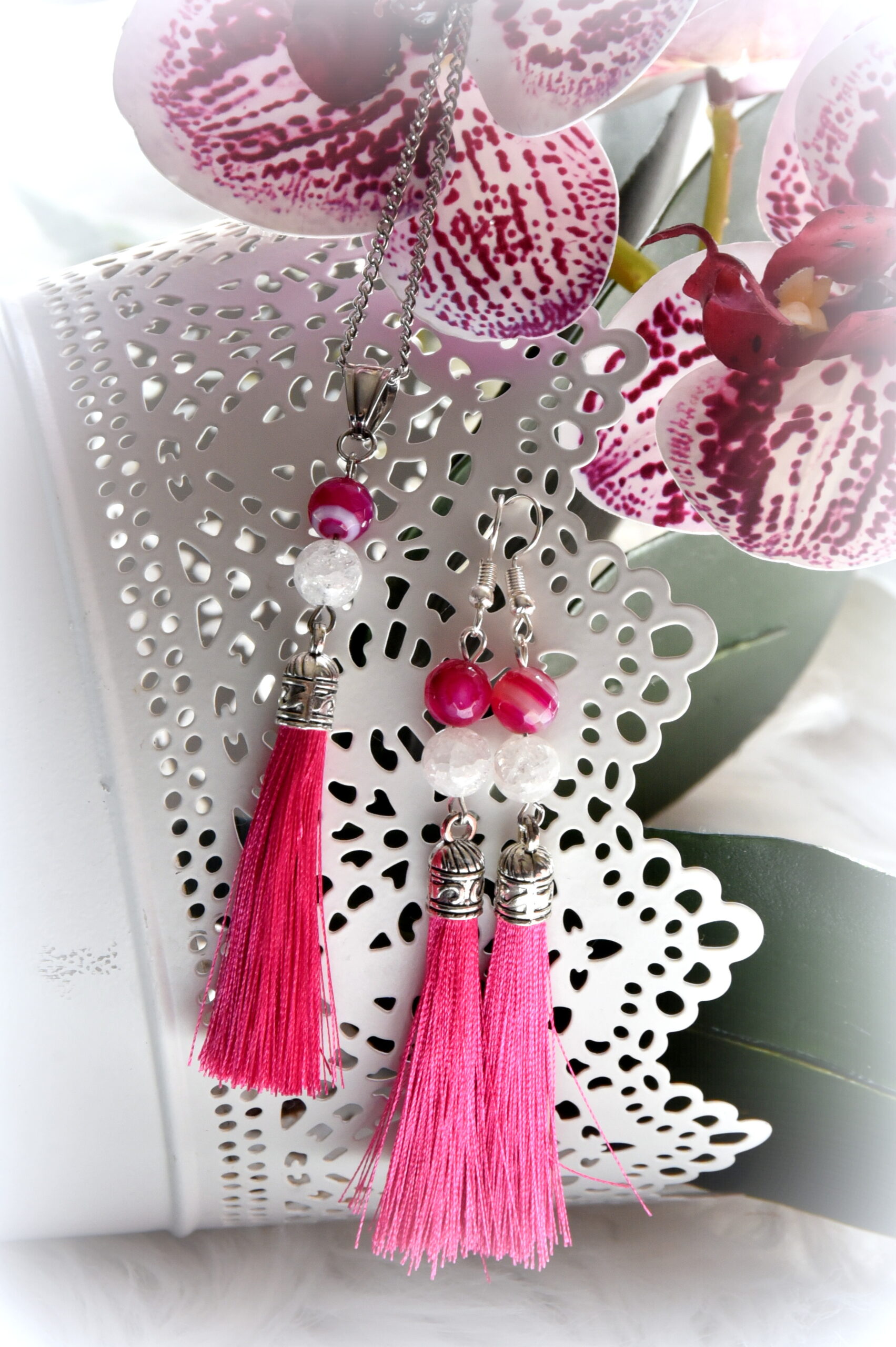Bojt fülbevaló: Kézműves termék, nikkelmentes, Achát és Hegyikristály ásvánnyal, pink bojttal. A termék hossza kb.: 7-8cm. Egyedi kérés és méret esetén, fordulj hozzám bizalommal!