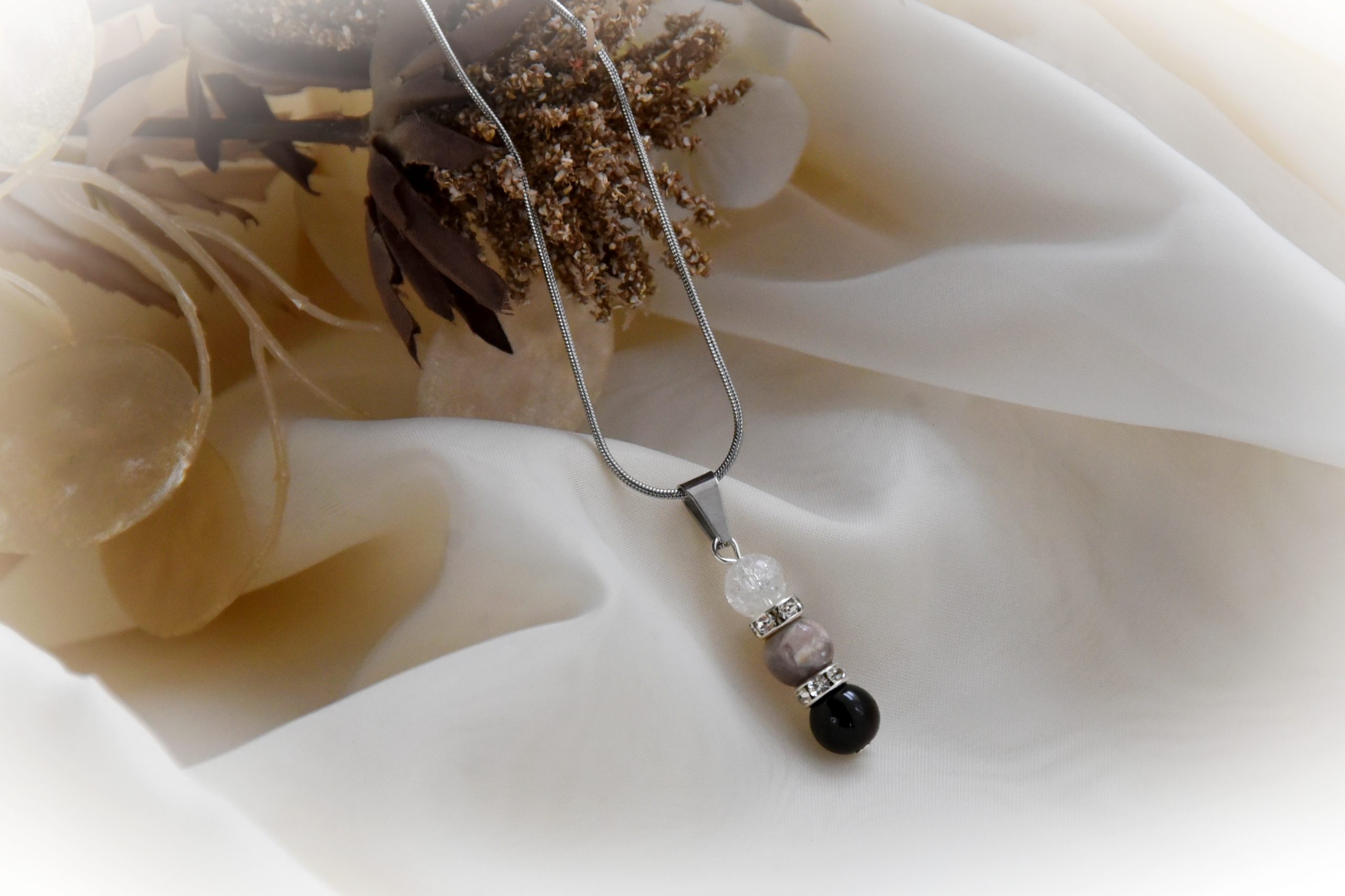 8 mm-es Turmalin és Hegyikristály ásványból készült, orvosi szerelékkel kombinált medál, orvosi kígyóláncon. A lánc hossza: 45cm.