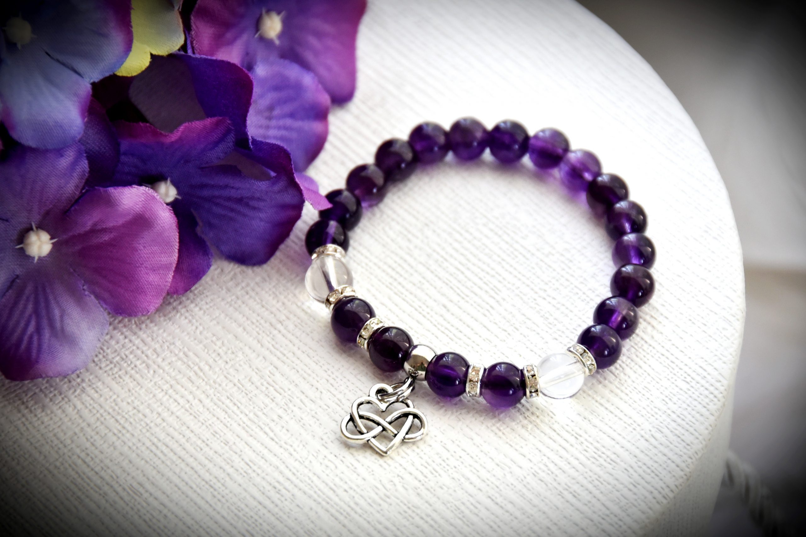 Vérnyomás és stresszoldás karbantartása Ametiszttel. Kézműves termék, Ametiszt és Hematit ásvánnyal, gumidamilra fűzve. A karkötőn nikkelmentes elemek találhatóak, végtelen szerelem fityegővel. Egyedi kérés és méret esetén, fordulj hozzám bizalommal!